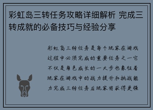 彩虹岛三转任务攻略详细解析 完成三转成就的必备技巧与经验分享